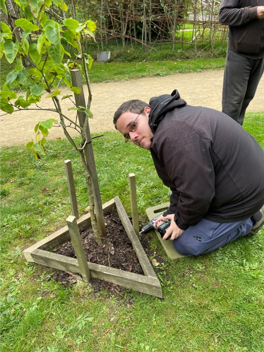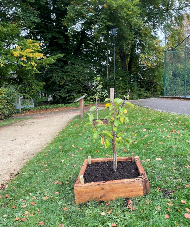 Here you can see volunteer Lawrence, putting the finishing touches to three new wooden triangular guards installed to protect the Lilac shrubs from grass maintenance and aid mulching; and a new Tom Putt apple tree, replacing a broken one, which has been planted in memory of our good friend and colleague David ‘Denim’ Keenan who very sadly passed away at the end of the summer.